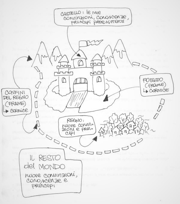 Quindi, potremmo dire che il frame, rappresenta i principi e le conoscenze che abbiamo maturato nel corso della nostra vita e che ci permettono di analizzare e interpretare il mondo che ci circonda. Rinnegare la presenza di una cornice significherebbe rinnegare il proprio passato. Sarebbe come mettere un mucchietto di polvere sotto al tappeto e nascondere tutte le esperienze e convinzioni che ci hanno portato ad essere le persone che siamo ora. Invece, riconoscere la presenza di una cornice che filtra la nostra interpretazione del mondo ci potrebbe permettere di circoscriverla, esplorarne le “mura di cinta” e trovare il ponte levatoio da abbassare. Avere il coraggio di attraversare quel ponte potrebbe essere l’inizio di una scoperta di nuove realtà e significati.