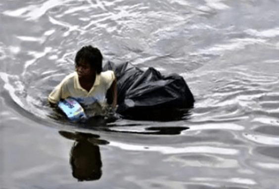 “Two residents wade through chest-deep water