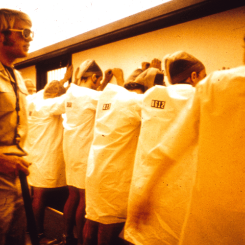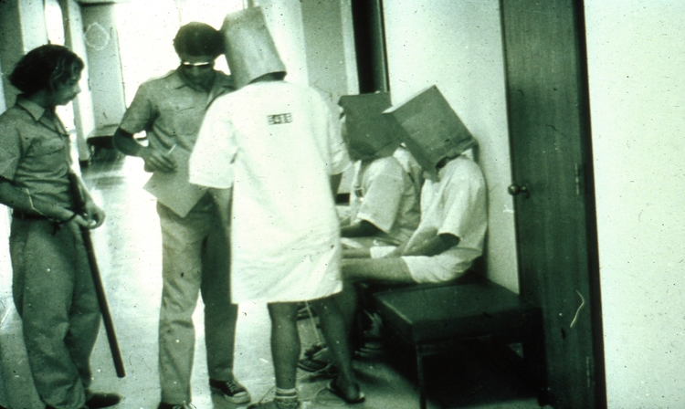 Arresto – La trasformazione dalla vita da studente universitario a quella di carcerato comincia senza preavviso. Una domenica mattina una pattuglia della polizia preleva il volontario da casa sua sotto gli occhi dei famigliari e dell’intero vicinato. Senza dichiarare l’inizio dell’esperimento e in collaborazione con il professor Zimbardo, gli agenti di polizia di Palo Alto arrestano i ragazzi con l’accusa di furto con scasso per cinque di loro mentre rapina a mano armata per gli altri quattro. Da quel momento in poi, ogni volontario selezionato per la posizione di carcerato avrebbe ricoperto quel ruolo fino alla fine dell’esperimento e la sua vita sarebbe stata molto simile a quella della maggior parte dei detenuti delle carceri statunitensi. Le procedure di rito che normalmente vengono effettuate al momento dell’arresto per i “veri” criminali vennero ripetute nell’esperimento: lettura dei diritti, manette, perquisizioni, registrazione di dati e impronte. Inoltre i ragazzi furono rinchiusi nelle celle della stazione di polizia di Palo Alto e bendati per essere poi trasferiti nel carcere simulato di Stanford.