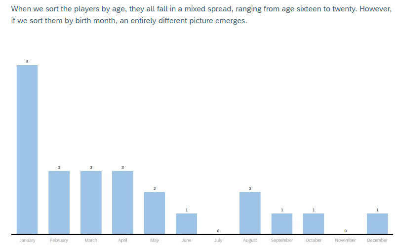 Quando selezioniamo i giocatori in base all’età, non emerge niente di significativo; oscillano dai 16 ai 20 anni. Tuttavia se li ordiniamo in base al mese di nascita, emerge uno scenario completamente differente: una grande percentuale di giocatori risulta essere nata all’inizio dell’anno con il mese di gennaio che domina su tutti gli altri.